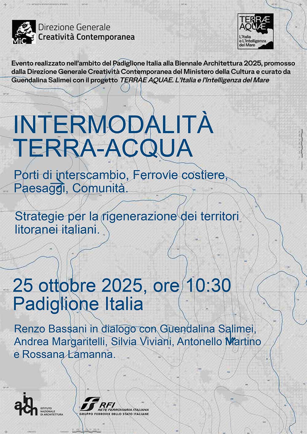 Al mattino, la tavola rotonda Intermodalità Terra-acqua, in sintonia con la visione del Padiglione Italia 2025, vuole tracciare indicazioni per la valorizzazione delle infrastrutture ferroviarie costiere come risorsa strategica per la rigenerazione dei paesaggi litoranei italiani e dei siti urbani con cui interagiscono, e stimolare visioni e proposte progettuali per la riconnessione tra infrastrutture, paesaggio costiero e tessuti insediativi.