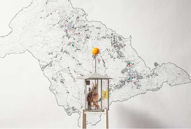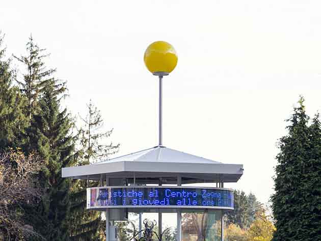 Un globo gemello si accende anche difronte all’ufficio Pro Loco al Centro Zegna per segnalarne l’apertura al pubblico. Al suo interno, Moro ha collocato una grande mappa tridimensionale e sonora che riproduce i rilievi altimetrici del territorio triverese. Azionandone i pulsanti, alcune sorgenti luminose identificano il posizionamento delle opere permanenti create finora per ALL’APERTO mentre la voce registrata dell’artista conduce alla scoperta dei lavori di Daniel Buren, Alberto Garutti, Stefano Arienti, Roman Signer, Marcello Maloberti e Dan Graham.