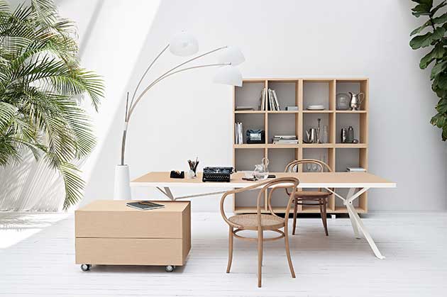 Se vita e lavoro tendono a identificarsi anche gli ambienti, gli strumenti e gli arredi diventano trasversali e i tradizionali mobili per l’ufficio assumono un look domestico e professionale al tempo stesso, come Revo di Manerba: la collezione prevede tavoli home-office e da pranzo, trasversali per casa e lavoro.