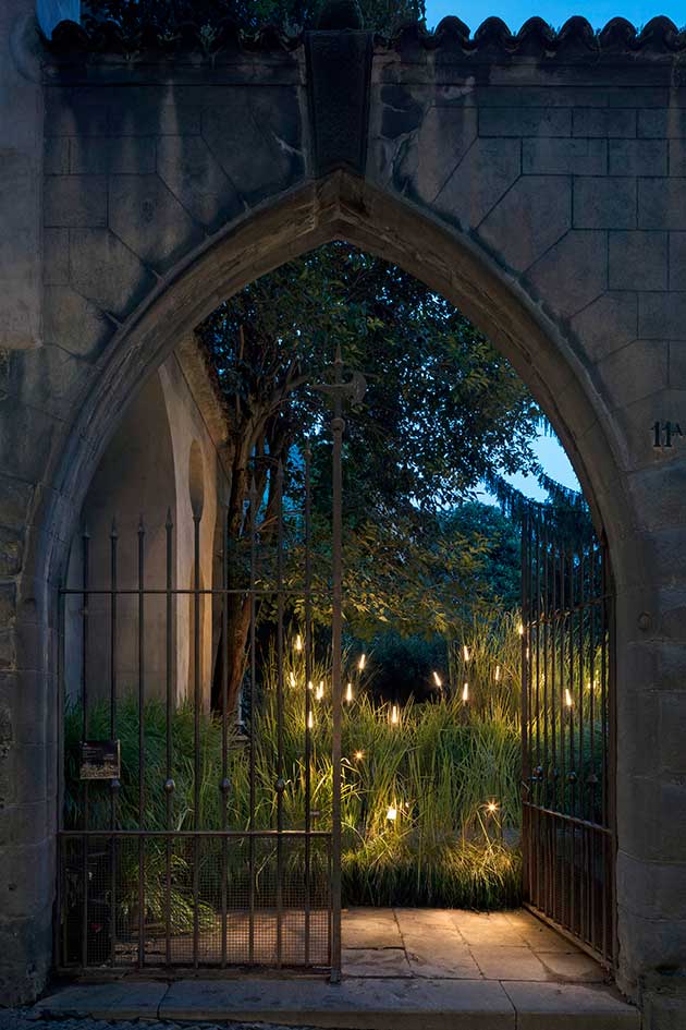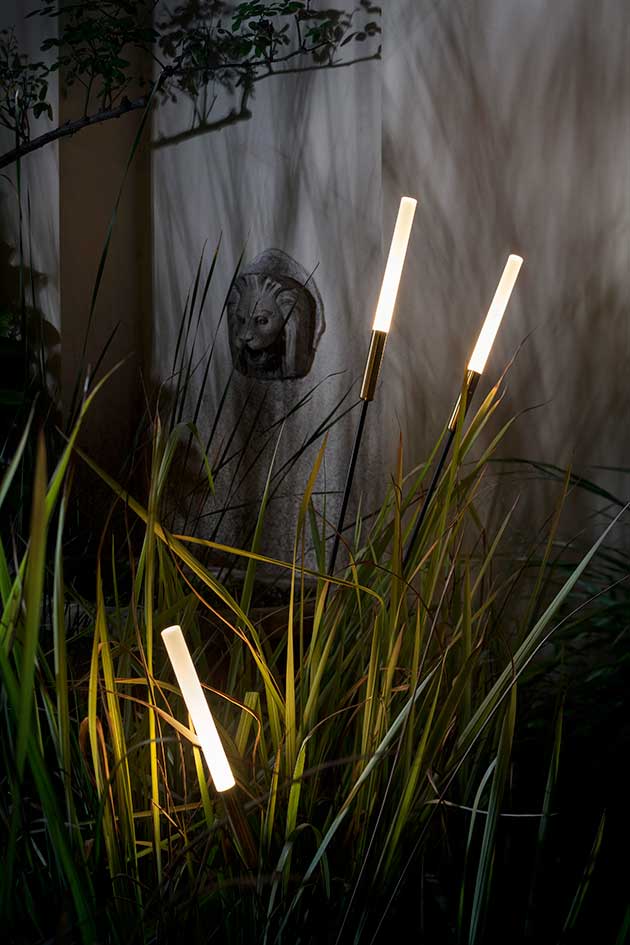 Nell’installazione progettata da Guido Parenzan e Maurizio Quargnale i sottili steli dalla punta luminosa Syphasera fioriscono tra la fitta vegetazione del giardino, in un notevole esempio di equilibrio e interazione tra elementi naturali e artificiali.