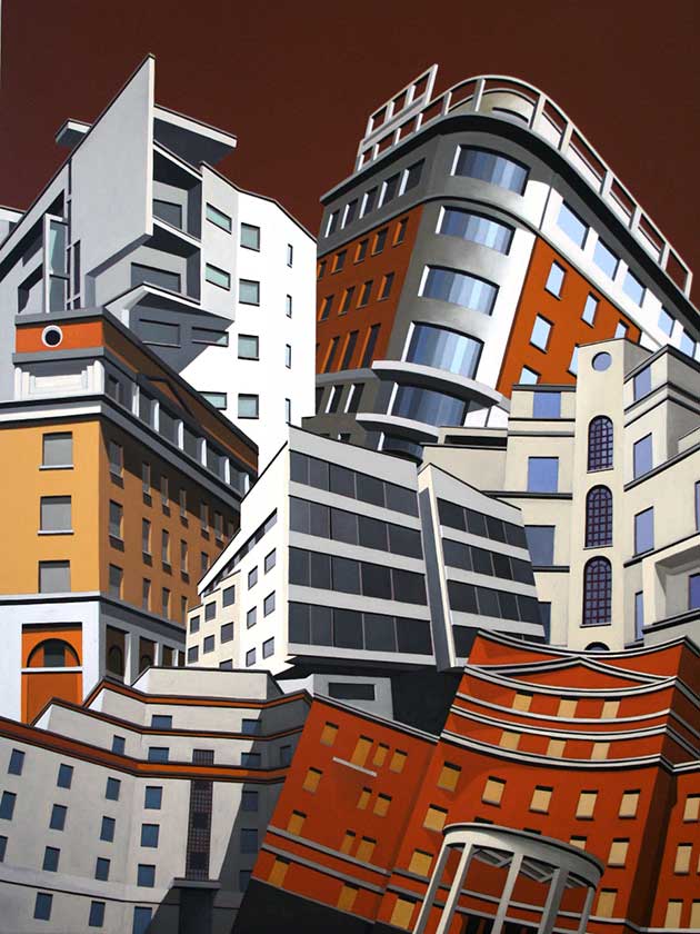 «Petrus – ricorda Elena Pontiggia –attraverso la raffigurazione dei capolavori di Muzio o Terragni, di Varisco o Portaluppi ha dipinto non solo quelle architetture, ma anche l’equilibrio o, più spesso, lo squilibrio in cui siamo immersi. Ha dipinto l’ordine, la capacità costruttiva, la vocazione propositiva, ma anche le torri di Babele che incontriamo nella nostra vita. L’architettura, nei suoi quadri, diventa anche qualcosa di pericolante, quando con la fine degli anni Novanta i suoi edifici iniziano a inclinarsi, a pendere obliquamente come moderne torri di Pisa. Oppure diventa qualcosa di enigmatico e di incongruente».