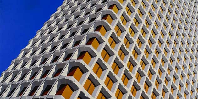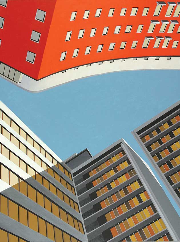 Marco Petrus lavora da più di vent’anni, a livello squisitamente pittorico, sulla rielaborazione delle architetture metropolitane, con una fortissima e progressiva stilizzazione di elementi che tende a volte, nell’estrema ricerca di sintesi di linee e toni cromatici, a sfiorare l’astrazione. Col tempo, il suo lavoro si è sempre più schematizzato dal punto di vista compositivo e si è “raffreddato”, in un processo di graduale e progressiva sottrazione di elementi realistici o narrativi, in favore di una sempre maggiore geometria compositiva e strutturale.