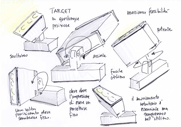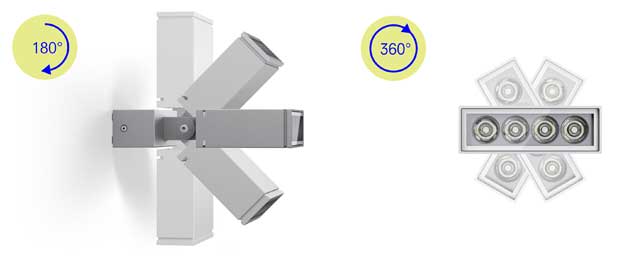 Gli snodi nascosti nel corpo dell’apparecchio rendono Target, realizzato in acciaio e alluminio anodizzato (due le versioni di colore, grigio e antracite) ruotabile rispettivamente di 180° e 360° sui suoi assi.