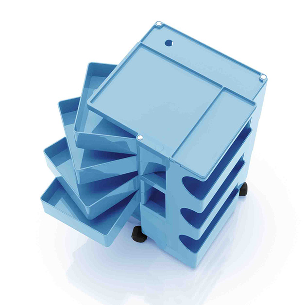 Il contenitore Boby disegnato da Joe Colombo nel 1970 è oggi disponibile in una nuova veste: ai classici colori (bianco, nero, rosso, alluminio, verde lime e grigio tornado) aggiunge la tonalità fresca del cielo e si colore in Bonnie Blue. Boby in Bonnie Blue è adatto in ogni ambiente della casa e negli spazi del contract.