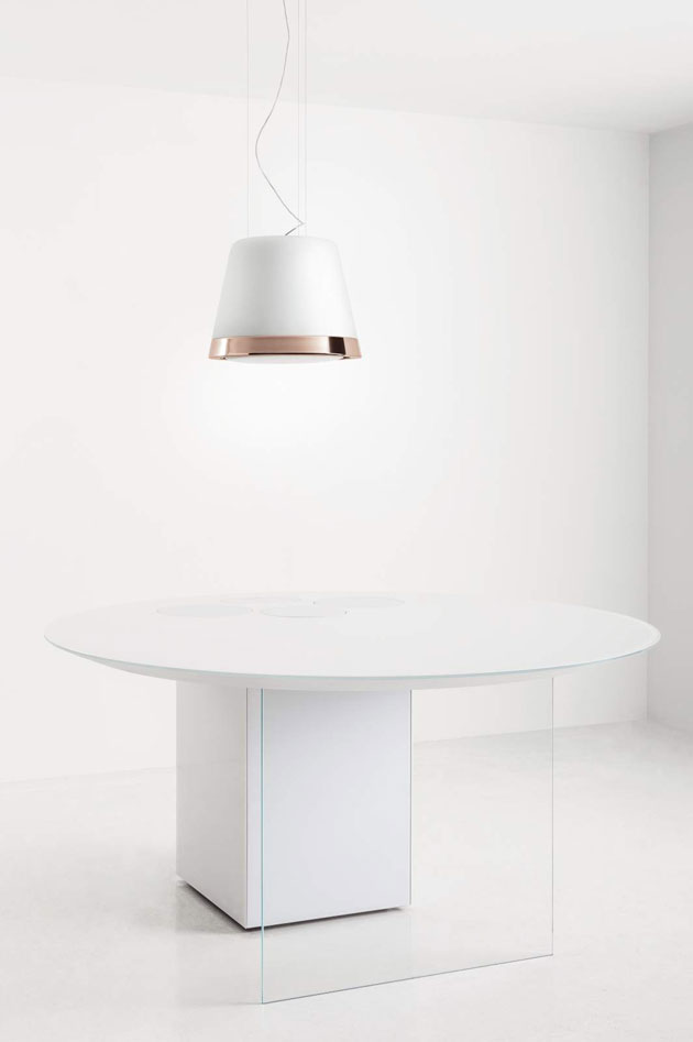 È caratterizzata da una sagoma circolare che trasforma l’isola in una tavola rotonda in grado di accogliere contemporaneamente il cuoco durante le sue preparazioni e i commensali, favorendo il dialogo e la condivisione. Sarà disponibile in diversi materiali e dimensioni e al Salone Internazionale del Mobile 2016 verrà presentata con top in vetro colorato bianco Puro Touch di diametro 180 cm. Sospesa su gambe in vetro, con piano di cottura a induzione e abbinabile al sistema cucina 36e8 in soluzioni a isola e penisola, la nuova cucina sarà presentata in abbinamento alla cappa lampadario Summilux di Elica in vetro bianco con finitura in metallo effetto rame lucido, disegnata da Fabrizio Crisà. La cappa, regolabile con un telecomando, è dotata di un impianto di doppia illuminazione a Led, filtri odori e sensori in grado di rilevare il tipo di cottura e la quantità di vapori emessi che calibrano il livello di aspirazione necessario.