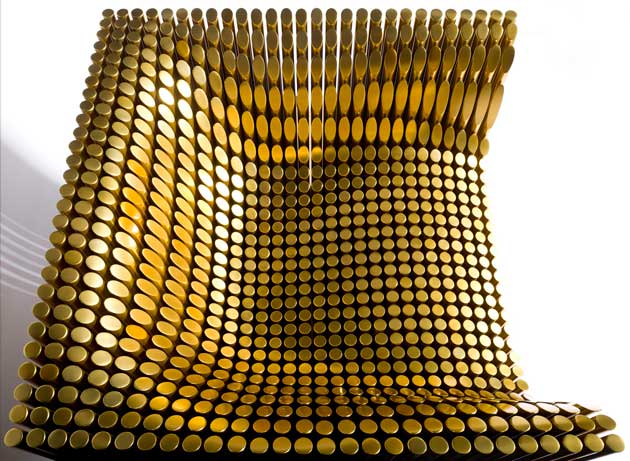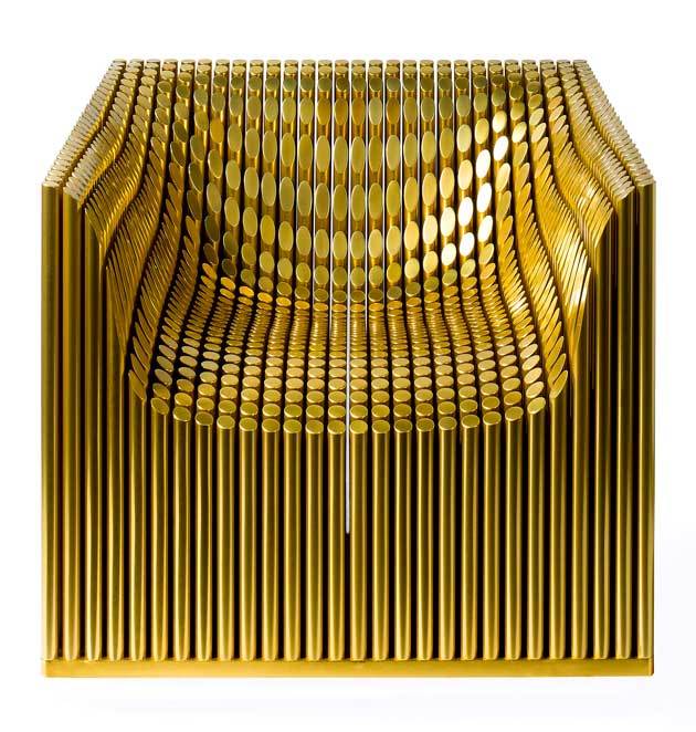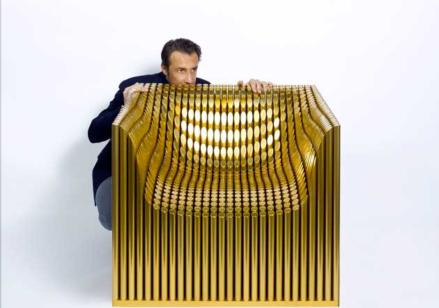 Presentata ufficialmente questa mattina in Triennale a Milano, 784 è una poltrona-scultura progettata e realizzata da Carlo Colombo assemblando appunto 784 barre di alluminio pieno di sezioni diverse, tagliate e finite in modo da rendere ergonomica la seduta.
