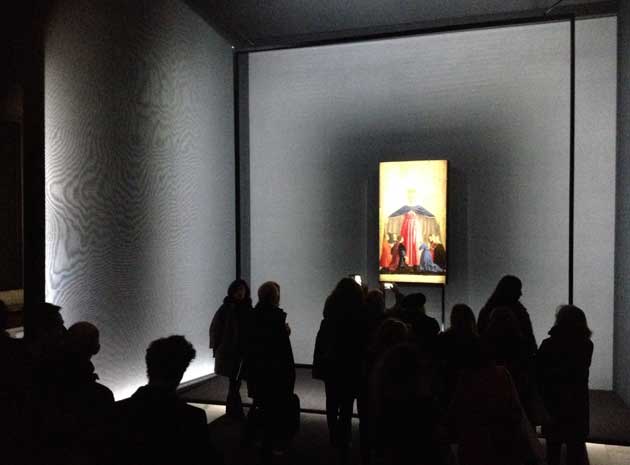 Progettato e curato da Migliore+Servetto Architects, l’allestimento valorizza l’opera collocandola al centro di una sagoma geometrica che, definita da un’esile struttura che regge un triplo strato di tessuto-non-tessuto, crea intorno alla pala un cannocchiale prospettico.