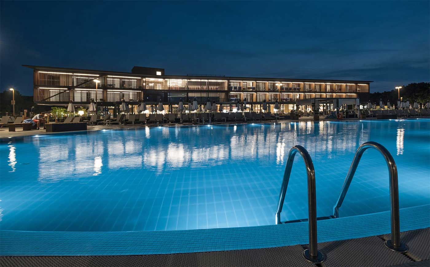 Per la climatizzazione e l’acqua calda sanitaria il resort fa ricorso alla geotermia, con pompe inverter che scambiano il calore a 600 metri di profondità, mentre l’acqua piovana viene raccolta per l’irrigazione.