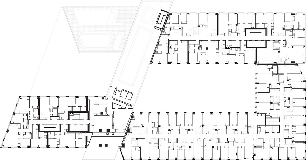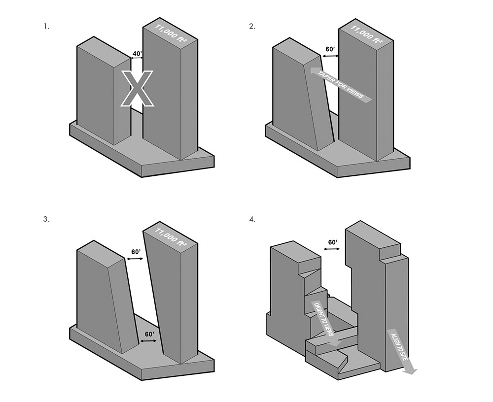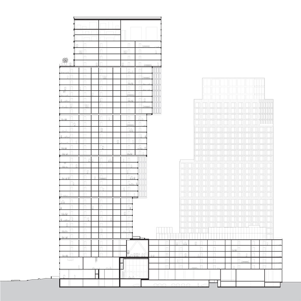 Per risolvere elegantemente il vincolo comunale che per l’area di cantiere prevedeva un’impronta al suolo di 11.000 metri quadrati, minimizzare l’impatto della costruzione sulla morfologia dell’area, aprire il sito all’acqua e soddisfare l’esigenza della proprietà – Brookfield Properties e Park Tower Group – di realizzare 745 unità immobiliari, il 30 per cento dei quali per regolamento comunale a canone agevolato, la sede newyorchese di Oma ha sviluppato un concept che allontana e al tempo stesso avvicina le due torri, con la più alta – 122 metri per 40 piani – che cresce per blocchi di 7 o 8 piani posti a sbalzi di 7,3 metri ciascuno uno sull’altro, come una moderna Ziggurat, e la più bassa (91 metri e 30 piani) che si allarga verso il suolo per affacciarsi su un nuovo parco sul lungomare a nord.