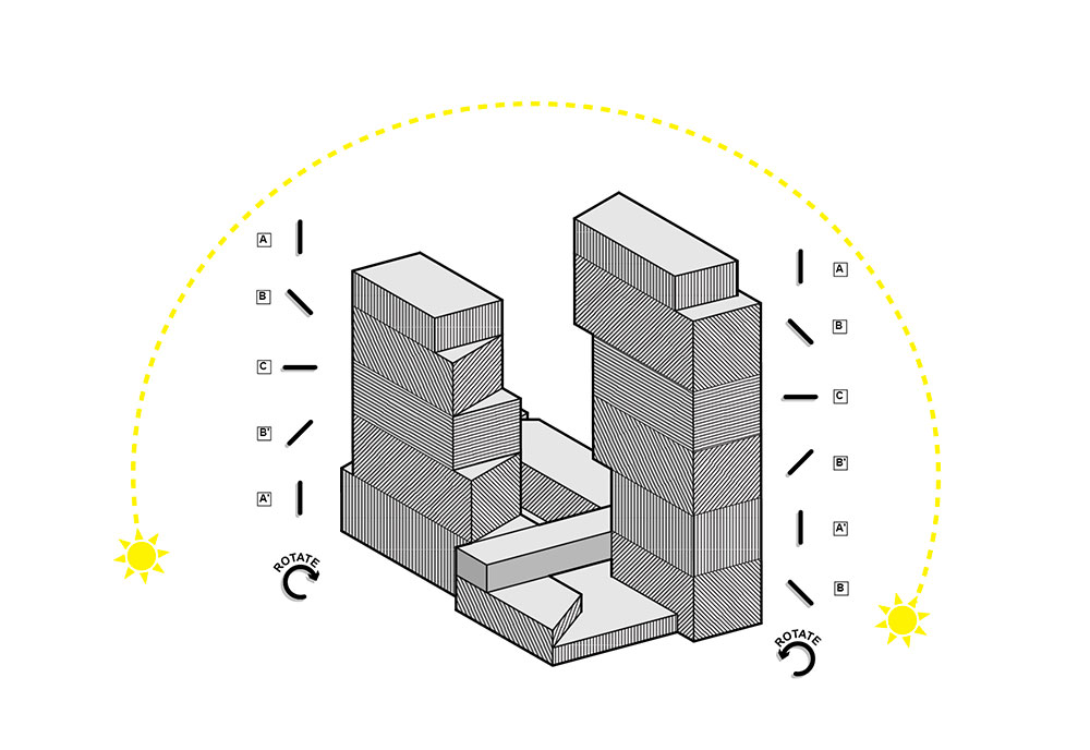 Le torri, contraddistinte da bucature regolari di 2 metri per 3 e da una facciata in pannelli cementizi bianchi scolpiti da scanalature orientate in direzioni alternate blocco per blocco che conferiscono tridimensionalità giocando con le ombre delle diverse ore del giorno, sono sagomate in modo da creare terrazze e sporgenze che le collegano enfaticamente, come se fossero state ritagliate da un unico blocco.