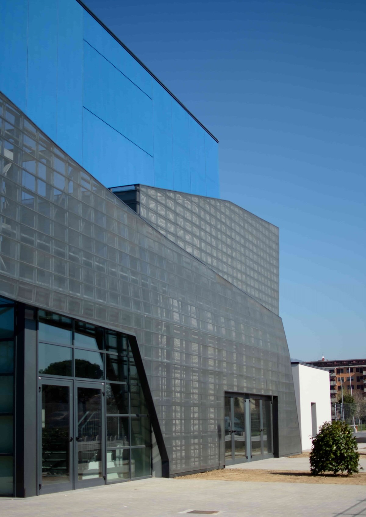 Dal punto di vista architettonico, il volume del foyer, rivestito in lamiera forata di rame rompe la regolarità del corpo principale. Le facciate in pannelli prefabbricati, posati in orizzontale e verticale, dialogano con le scale esterne in acciaio che accentuano l’idea di scomposizione geometrica. All’interno, la copertura reticolare in acciaio bianco definisce un vero e proprio quinto prospetto, mentre il contrasto cromatico tra le tribune multicolore e i toni neutri delle strutture conferisce dinamismo allo spazio.