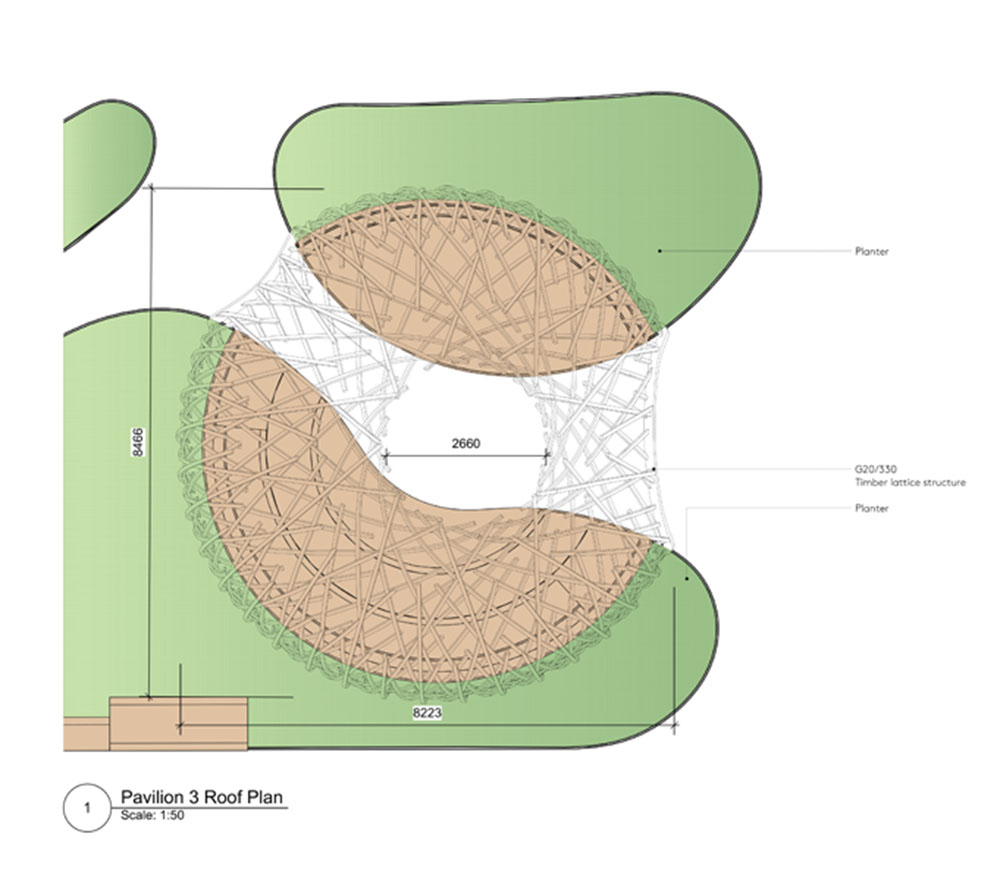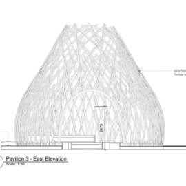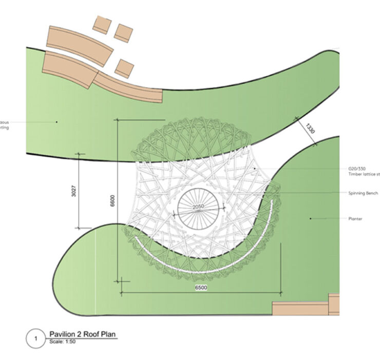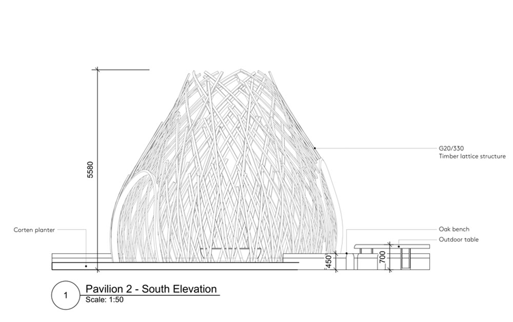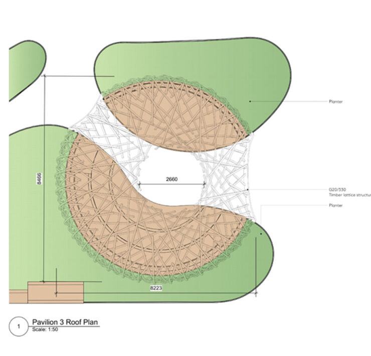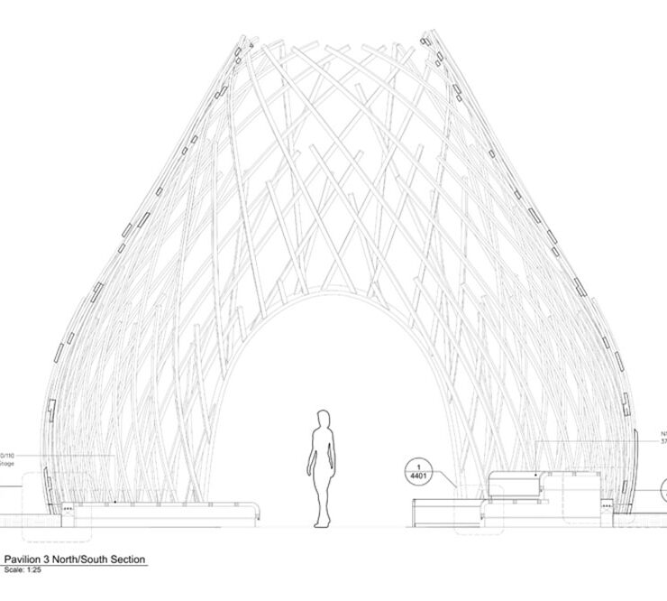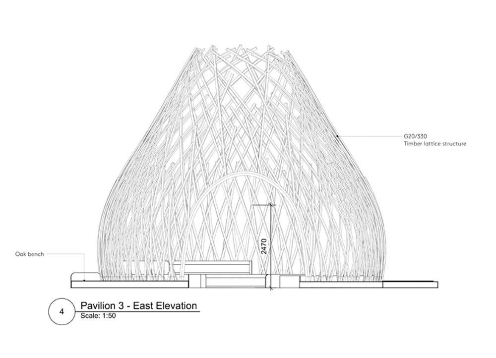 Partendo da schizzi, modelli e simulazioni per determinare la forma, le dimensioni e la posizione dei tre padiglioni, Nex- ha poi collaborato con il partner Xylotek per completare gli studi computazionali che hanno sviluppato le strutture reticolari irregolari in modelli geometricamente rigorosi ma non uniformi di sottili listelli di quercia piegati e laminati nelle loro forme curve su supporti di grandi dimensioni, sovrapposti per creare i reticoli e, infine, trasportati in loco per l’assemblaggio.