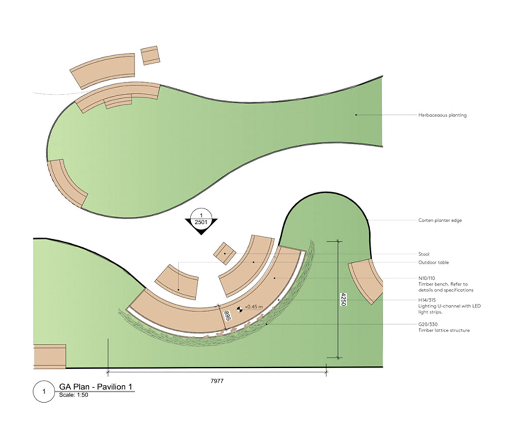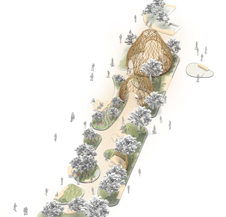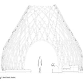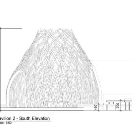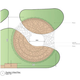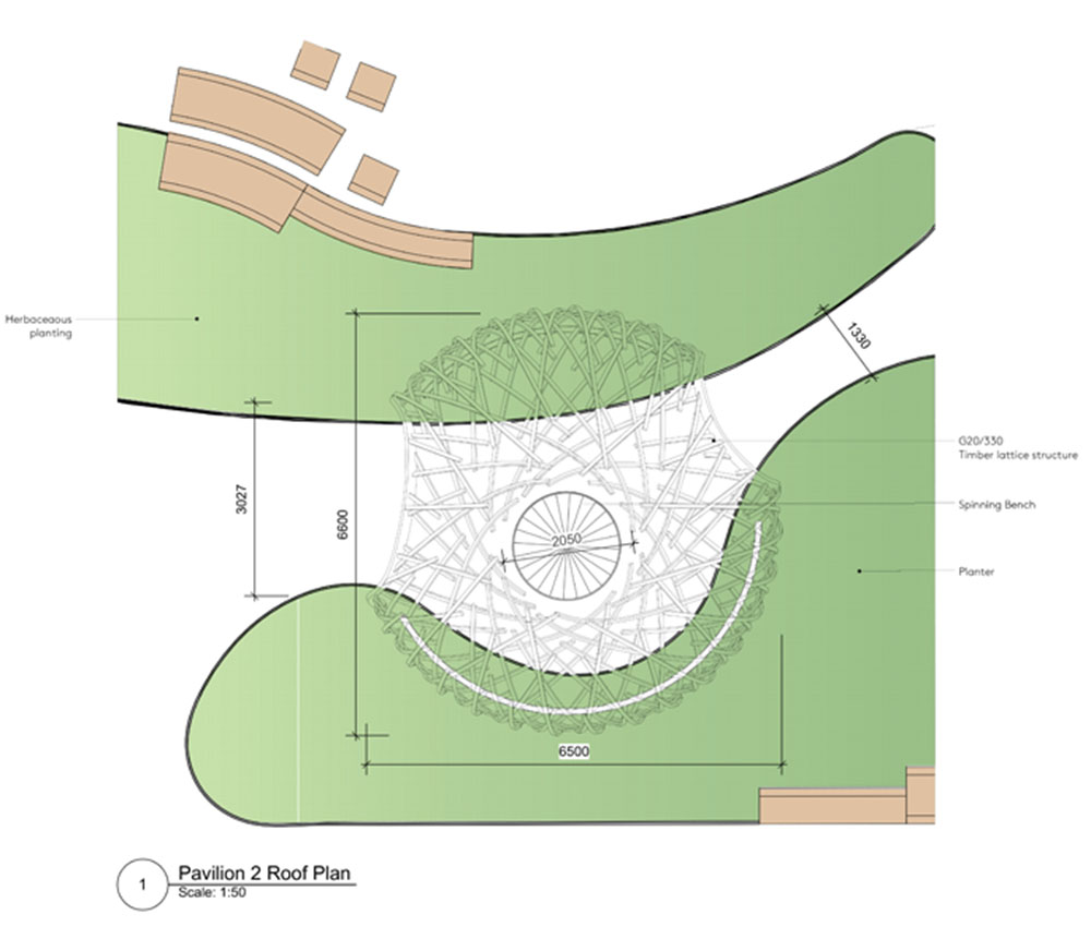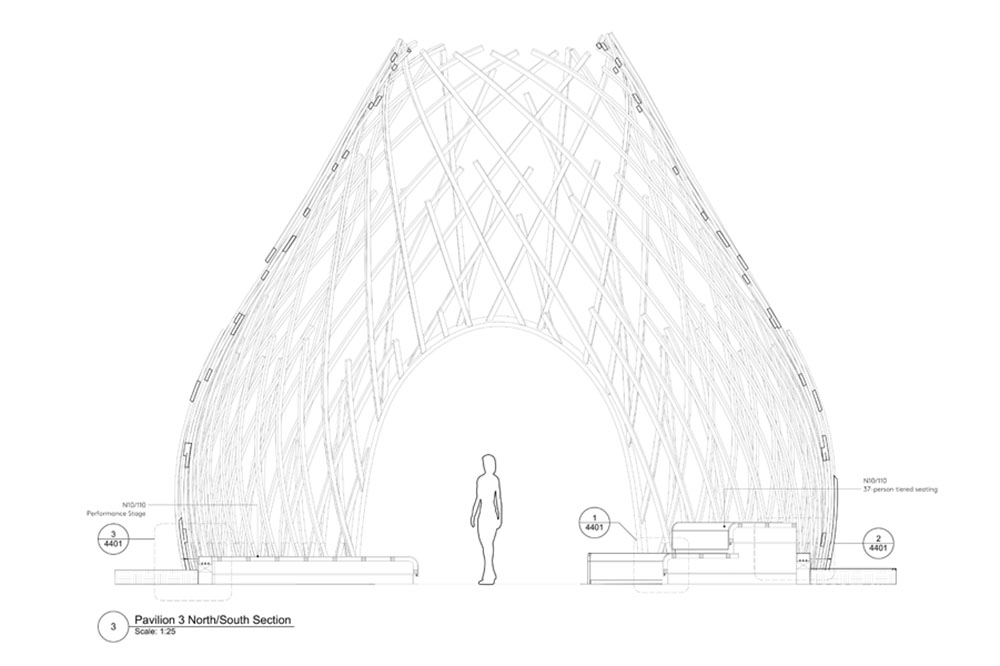 Partendo da schizzi, modelli e simulazioni per determinare la forma, le dimensioni e la posizione dei tre padiglioni, Nex- ha poi collaborato con il partner Xylotek per completare gli studi computazionali che hanno sviluppato le strutture reticolari irregolari in modelli geometricamente rigorosi ma non uniformi di sottili listelli di quercia piegati e laminati nelle loro forme curve su supporti di grandi dimensioni, sovrapposti per creare i reticoli e, infine, trasportati in loco per l’assemblaggio.