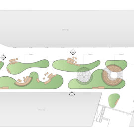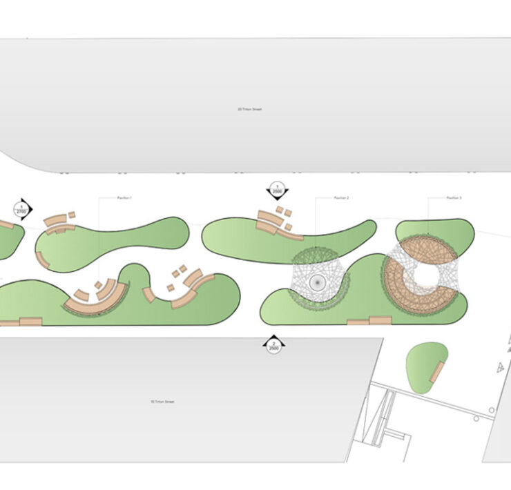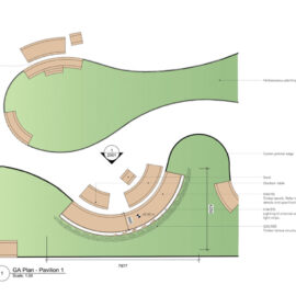 I due padiglioni più grandi hanno un oculo centrale che invita a osservare il cielo. Da ovest verso est i padiglioni aumentano di dimensioni: il primo costruisce dei piccoli salotti urbani, il secondo ha un grande seggiolino circolare girevole posizionato al centro del percorso.