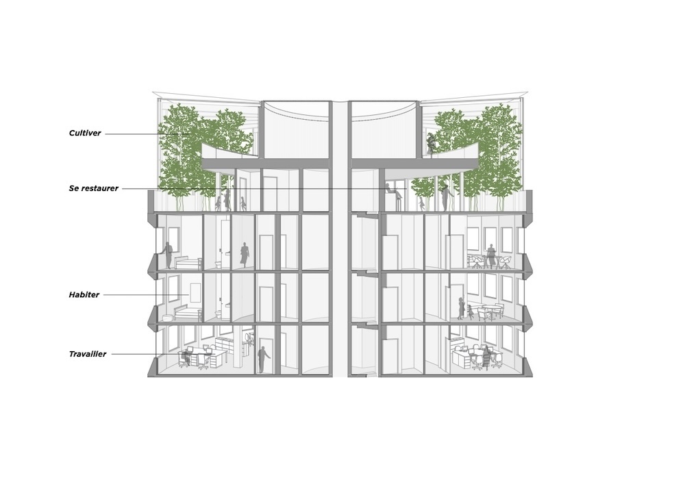 La ex soffitta al decimo piano è stata sostituita con una struttura in legno e vetro adibita a serra. Proiettata verso il cielo, questa corona ospita uno spazio didattico dedicato all’agricoltura urbana e un bar, entrambi accessibili a tutti gli utenti dell’edificio. Questo nuovo spazio alberato, trasparente e luminoso, offre una vista unica di Parigi e si trasforma la torre in una sorta di lanterna.