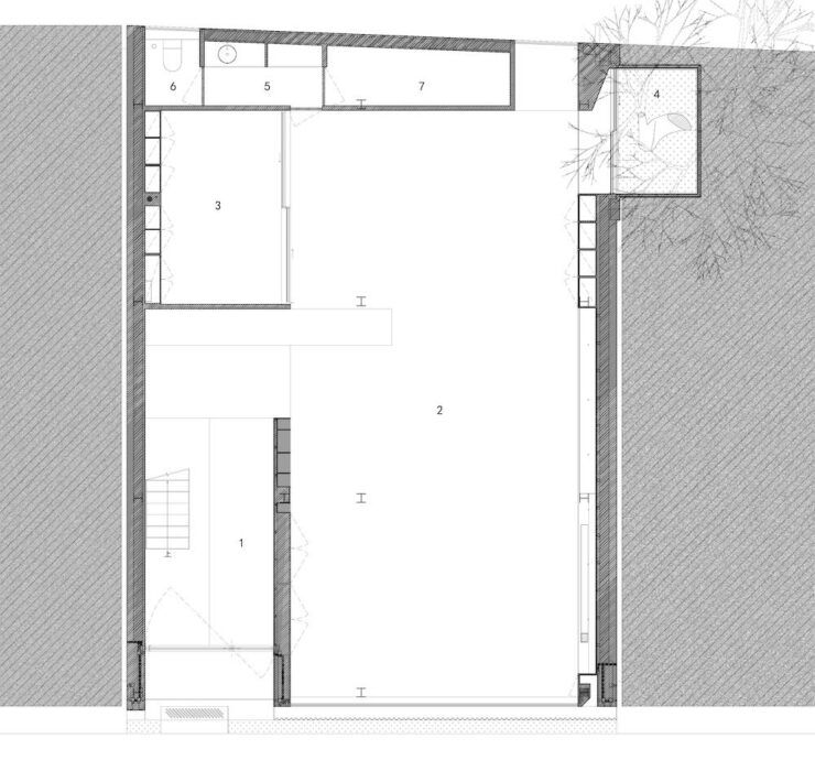 Nonostante l’assenza di elementi naturali nel contesto immediato, lo studio ha introdotto una relazione costante tra architettura e paesaggio, creandola ex novo. Una stretta intercapedine individuata durante la demolizione è stata trasformata in un cortile alberato, visibile dalla hall d’ingresso e affacciato sul nuovo balcone del terzo piano.