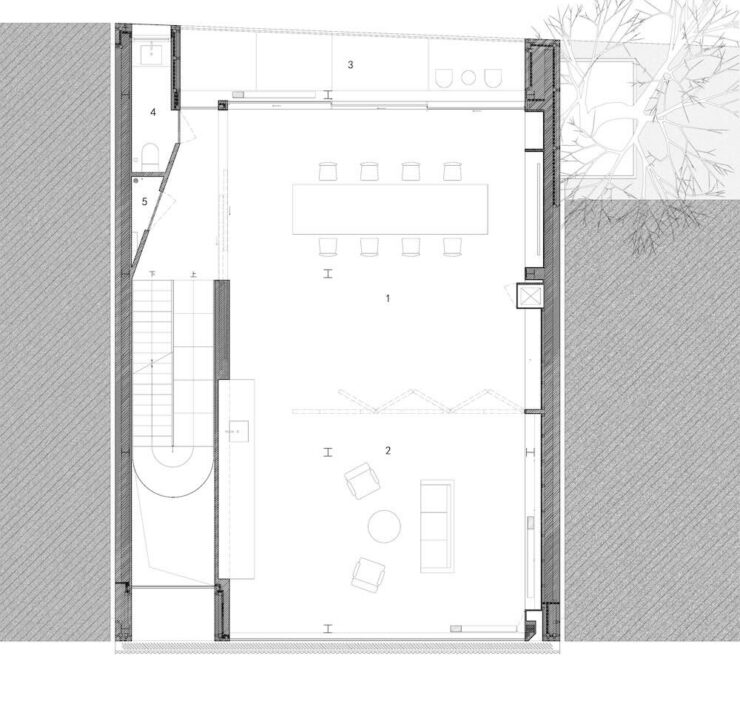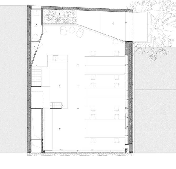 Lo spazio si restringe e si apre, suggerisce traiettorie, produce inaspettate transizioni di luce e respiro. La verticalità, costretta dalle dimensioni ridotte del lotto, viene interpretata come elemento narrativo. Fino al micro-cortile sul tetto: una fessura di cielo e verde che spezza il ritmo del lavoro e offre una pausa contemplativa.