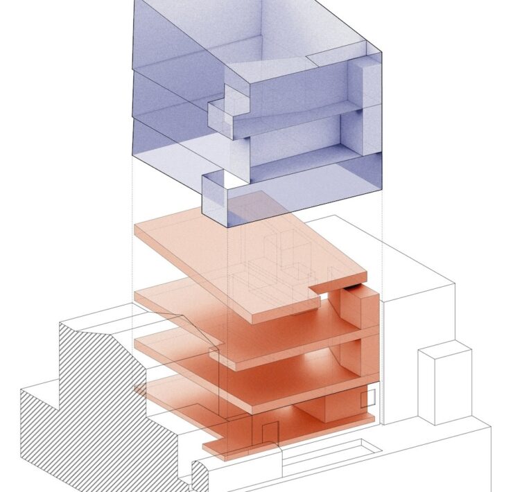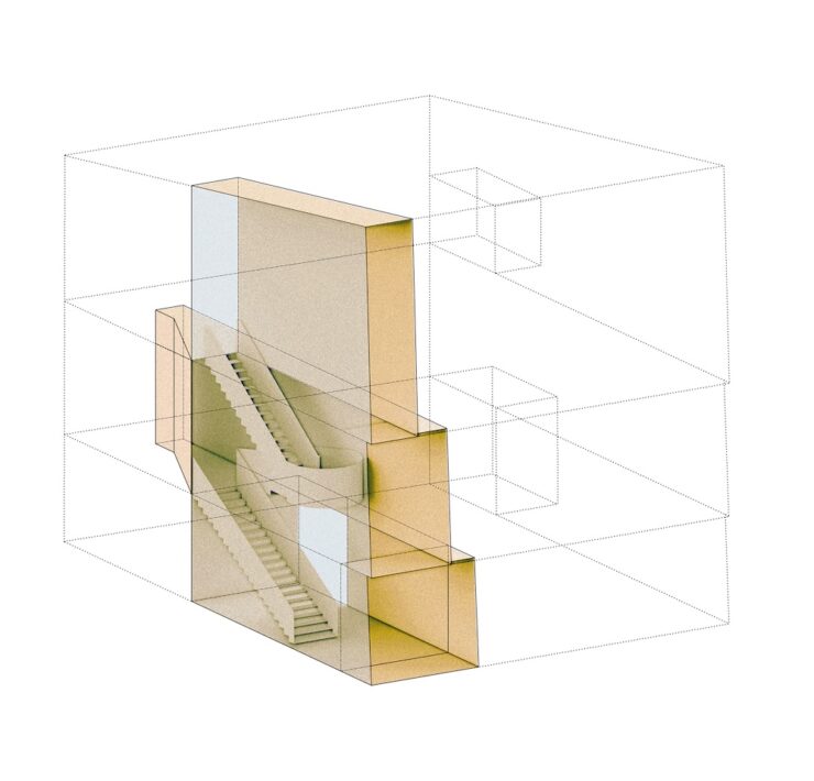 Nel rispetto della sagoma originaria, il progetto è intervenuto innanzitutto sul sistema distributivo. I tre livelli – destinati a esposizione, accoglienza e lavoro – sono messi in comunicazione da un vuoto verticale che attraversa l’intero edificio, generando continuità spaziale e visiva.