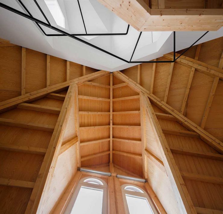 Le fotografie di Ivo Tavares Studio mostrano i grandi volumi massicci che compongono gli interni in dialogo con il legno delle travi e dei pavimenti.