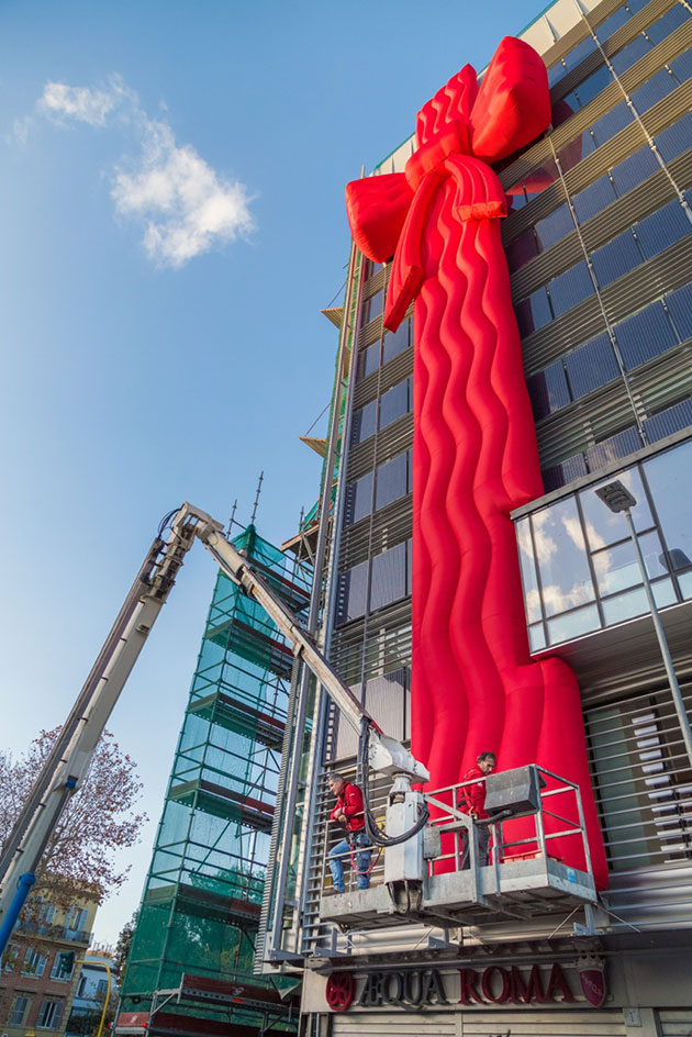 Sul palazzo di Julio Lafuente – progettato nel 1977 dall’architetto spagnolo Julio Lafuente per Esso in collaborazione con l’ingegnere Gaetano Rebecchini e ora sede di aziende – i fiocchi sono su entrambi i lati dell’edificio, sia sull’ingresso principale sia sul lato sud (il primo misura 30 metri per 7, l’altro 10×7), mentre nel giardino antistante si può vedere un enorme rocchetto di nastro rosso con un paio di forbici, suggerendo l’intenzione di completare la decorazione.