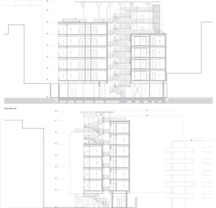 In linea con la tipologia architettonica storica del quartiere, la casa a ballatoio è stata reinterpretata in chiave contemporanea, con una scala condominiale scoperta in metallo blu che funge da asse di collegamento verticale e orizzontale. Questo elemento architettonico è stato pensato non solo come infrastruttura funzionale, ma anche come elemento scultoreo e spazio sociale, con punti di sosta e sedute per favorire l’incontro tra i residenti.