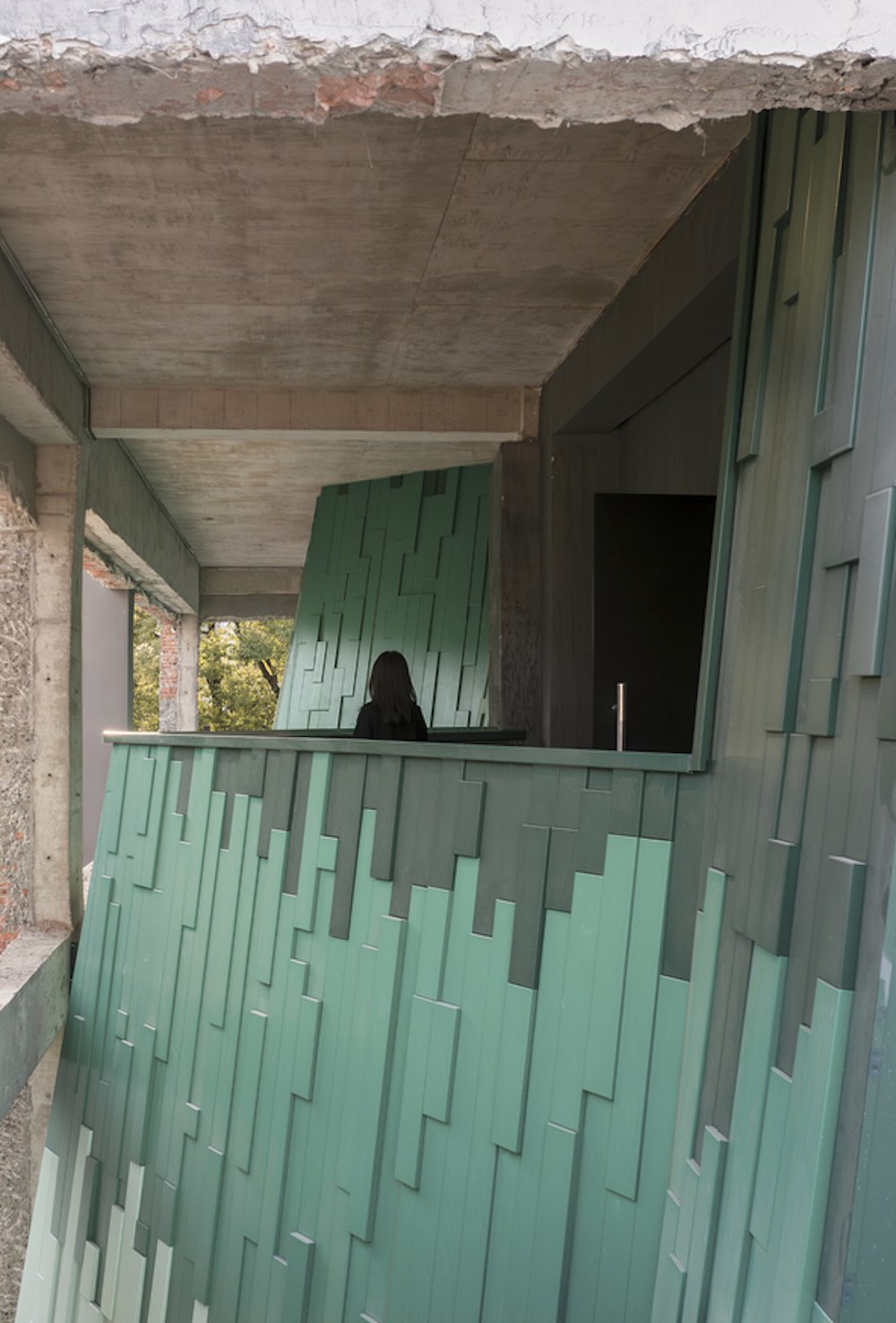 All’esterno, la facciata interpreta il paesaggio Shan Shui – genere tradizionale cinese di pittura di paesaggio fondata su sovrapposizioni di monti e acque – attraverso un doppio layer materico: una mesh metallica in primo piano richiama la figura della montagna, mentre pannelli pieni sullo sfondo costruiscono la massa.