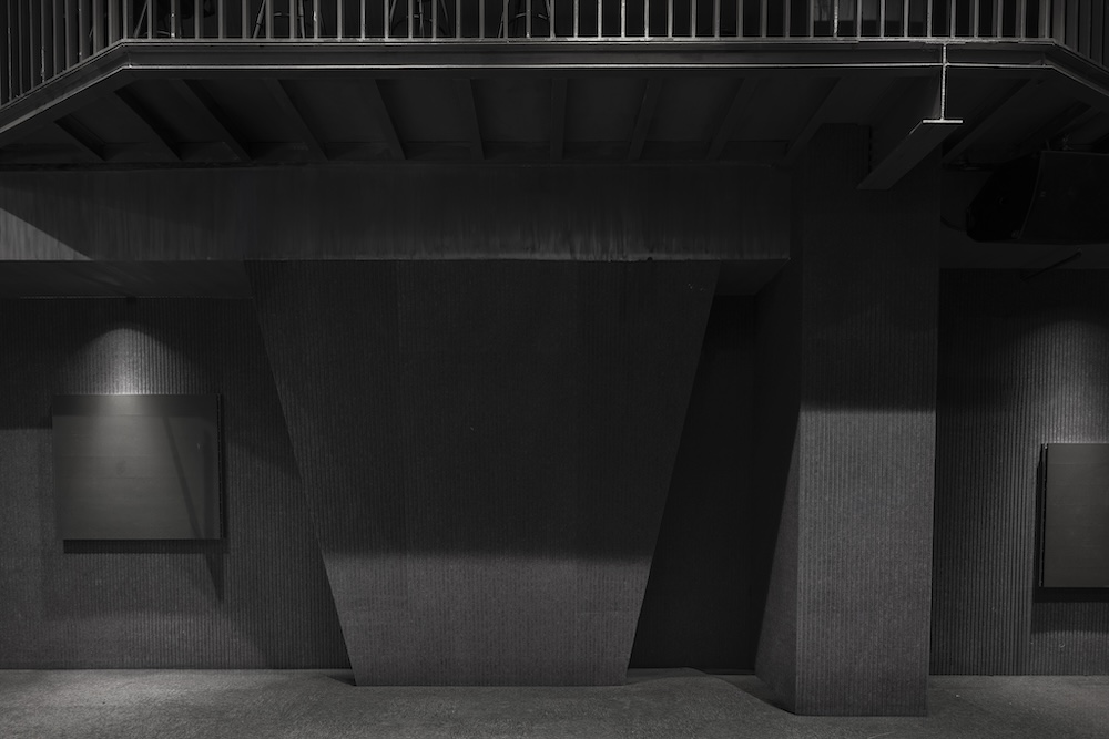 Un mezzanino in acciaio inclina le pareti e introduce un attraversamento quasi scenografico della sala, enfatizzato da un palco a “I” che rompe la tipologia teatrale convenzionale e aggiunge flessibilità performativa.