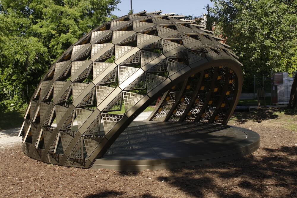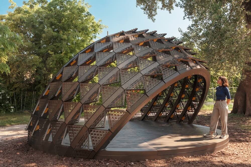 Il progetto, sviluppato in collaborazione con Metadecor, Airshade Technologies, Alumet e altri partner, è un sistema di ombreggiatura cinetica, una struttura che reagisce alla luce solare esclusivamente attraverso principi fisici passivi, senza fare uso di energia elettrica, sensori o motori.