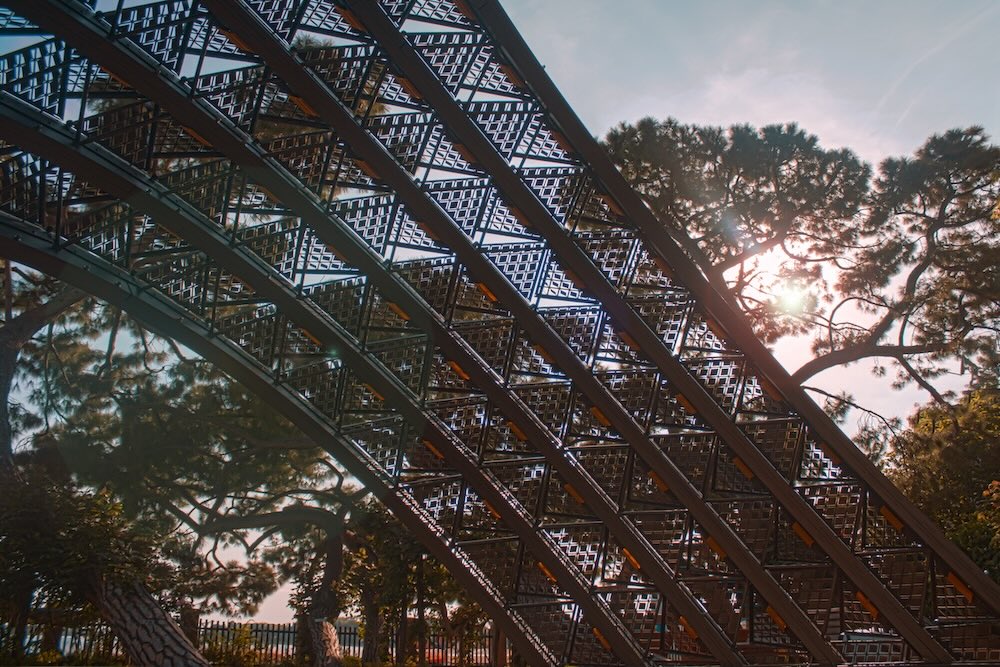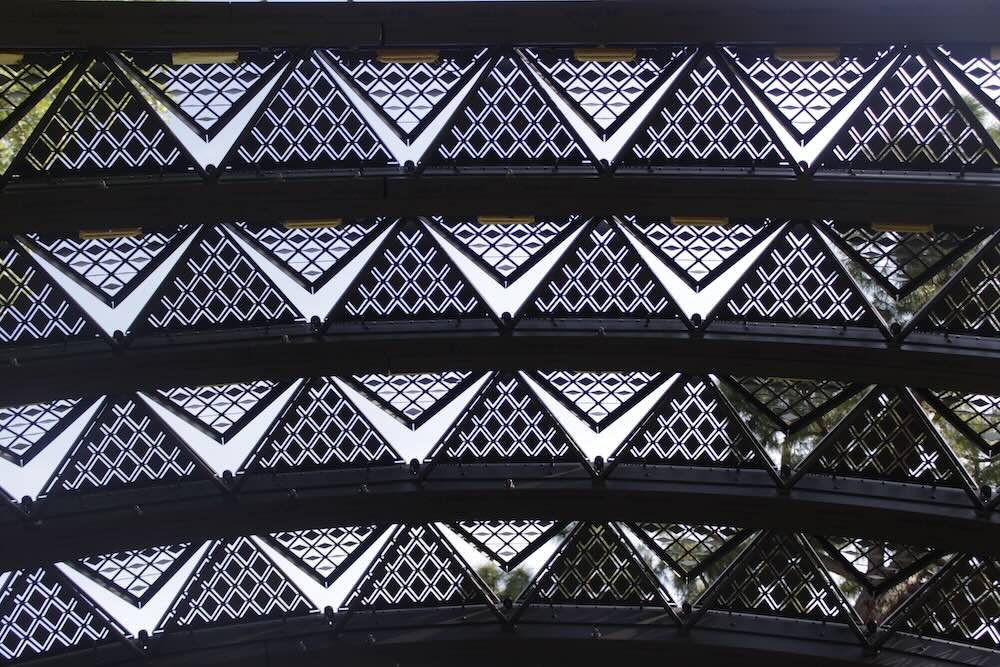 Su questi archi, ricavati da travi riutilizzate, sono fissati pannelli triangolari in lamiera forata che garantiscono un’ombreggiatura puntinata. In assenza di sole diretto restano aperti, mentre si chiudono automaticamente quando colpiti dalla luce intensa, modulando la radiazione solare come un organismo che cambia postura durante il giorno.