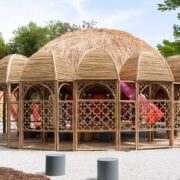 Il padiglione dichiara il proprio legame con il sole anche nei dettagli simbolici: il pavimento circolare è inciso con un grafico del percorso solare, mentre l’intradosso degli archi riporta la scritta “sun and shade” in oltre 200 lingue – a sottolineare la dimensione universale del rapporto tra esseri umani e luce solare.