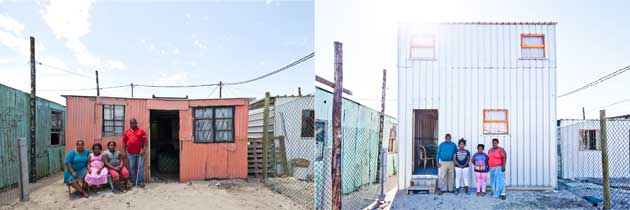 il rifugio dove abitava la famiglia dello slum di Khayelitsha e la stessa famiglia davanti al prototipo di Empower Shack |