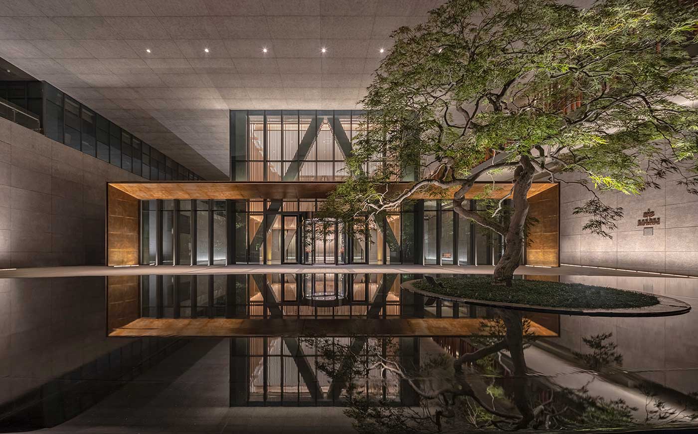 In uno dei quattro ristoranti dell’hotel, il vegetariano Jia Shu, la trama naturale del legno, espressa sotto forma di griglie, si integra nello spazio e si completa con la presenza diffusa della vegetazione. Il verde rompe il confine tra umano e naturale. I colori a bassa saturazione tonificano la delicata eleganza dello spazio. I tavoli, le sedie, le luci soffuse sono volutamente semplici ed essenziali.