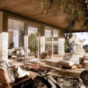 Acqua, pietra e piante nel cortile formano un paesaggio zen naturale. Il progetto approfondisce le esperienze multisensoriali degli ospiti con una relazione fluida tra l’interno e l’esterno.