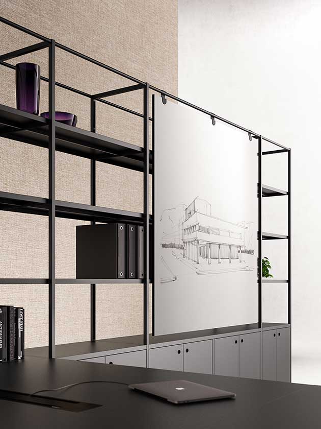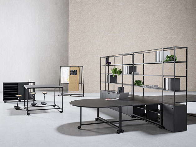 La geniale mobile pinboard permette di tenere riunioni ovunque ed eventualmente sganciare il pannello con gli appunti o un moadboard di tessuti portandolo alla propria postazione o appendendolo alla libreria per un’ulteriore condivisione.