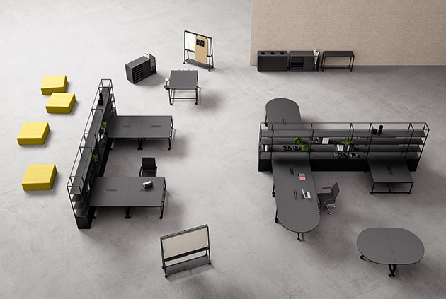 Lo schema composito di Atelier si articola in quattro elementi principali: una workstation configurabile, un collaboration table a altezza 105 multifunzione e altrettanto configurabile, una famiglia di contenitori dinamici compresi di mobile pinboard e un sistema libreria-contenimento.