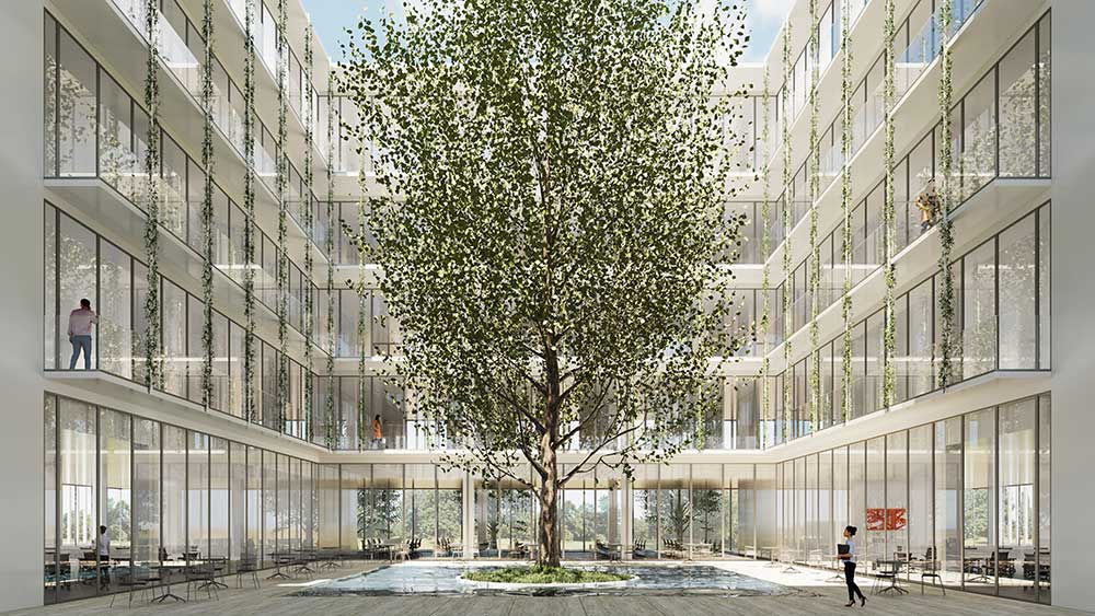 Anche intorno alle corti, lo studio ha progettato uno spazio esterno fruibile, un ballatoio ideale per concedersi una pausa e ritrovarsi con i colleghi. All’interno i tre volumi sono definiti per sottrazione di elementi e sono punteggiati sui vari piani da giardini pensili, che si aggiungono alle aree verdi delle corti e delle piazze, in stretta connessione con gli edifici.