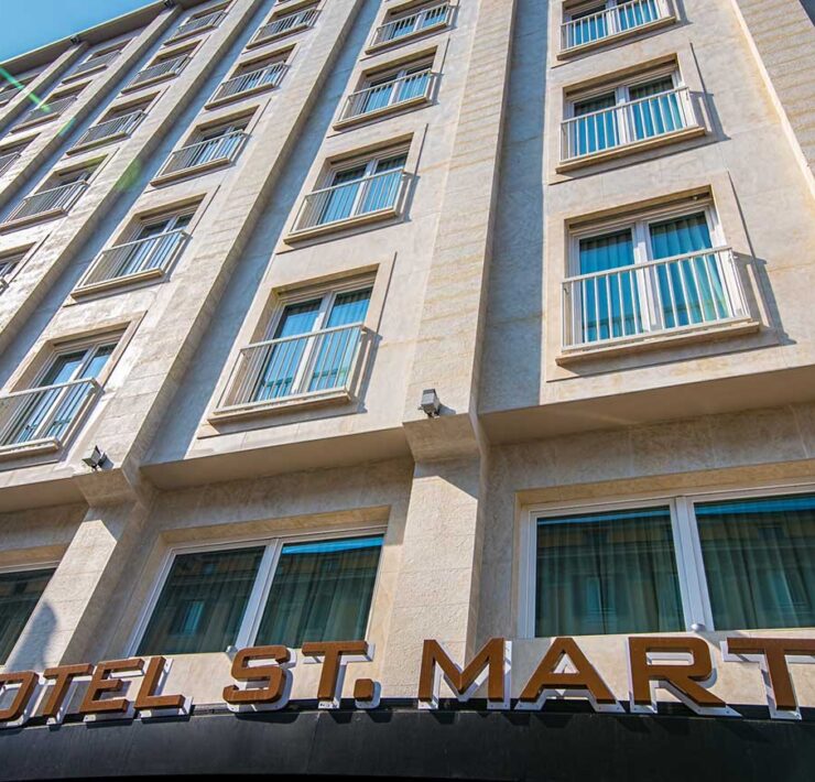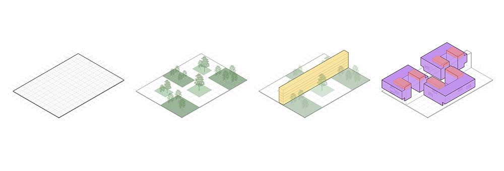 Una maglia regolare di 7,5 per 7,5 metri definisce il passo strutturale che scandisce la superficie rettangolare di oltre 9.000 metri quadrati suddivisa in sei ambiti, con spazi verdi distribuiti in tre corti e tre piazze verdi. Un basamento in travertino di 80 cm sottolinea visivamente il perimetro dell’intervento e distacca il complesso dalla quota stradale.