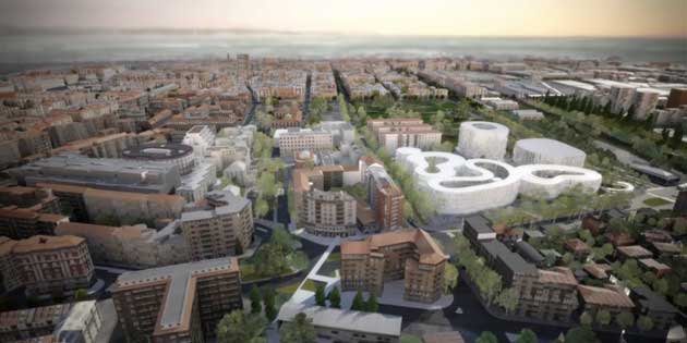 Il futuro campus della Bocconi (visto da ovest). Il complesso universitario è costituito da una torre di dieci piani, quattro edifici per la didattica, un centro sportivo e 300 posti letto (fonte, Bocconi) |
