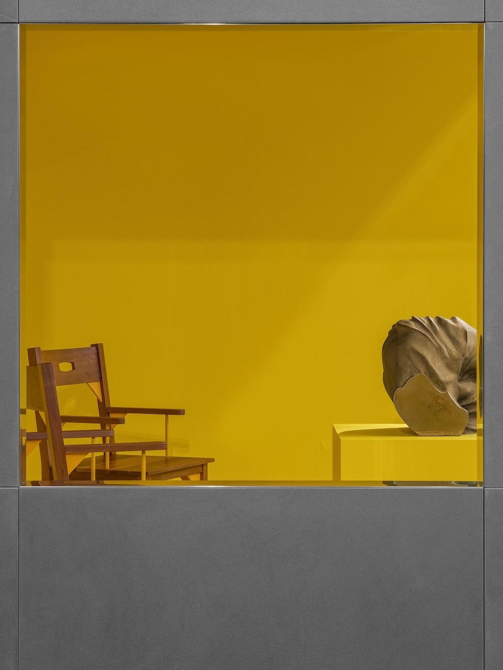 L’intervento è allestito nell’ambiente centrale di Spazio UniFor, progettato da Herzog & de Meuron, e si articola in quattro grandi cubi concepiti come micro-architetture museali: stanze autonome che accostano direttamente oggetto e scultura, introducendo anche un riferimento al tema del colore, presente nel lavoro di Rossi per UniFor.