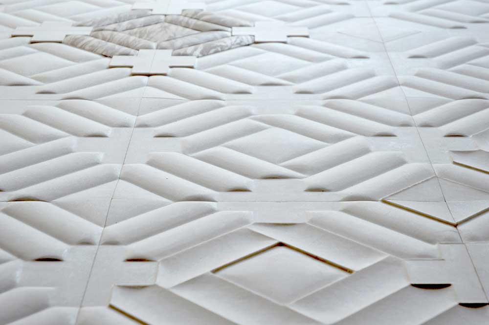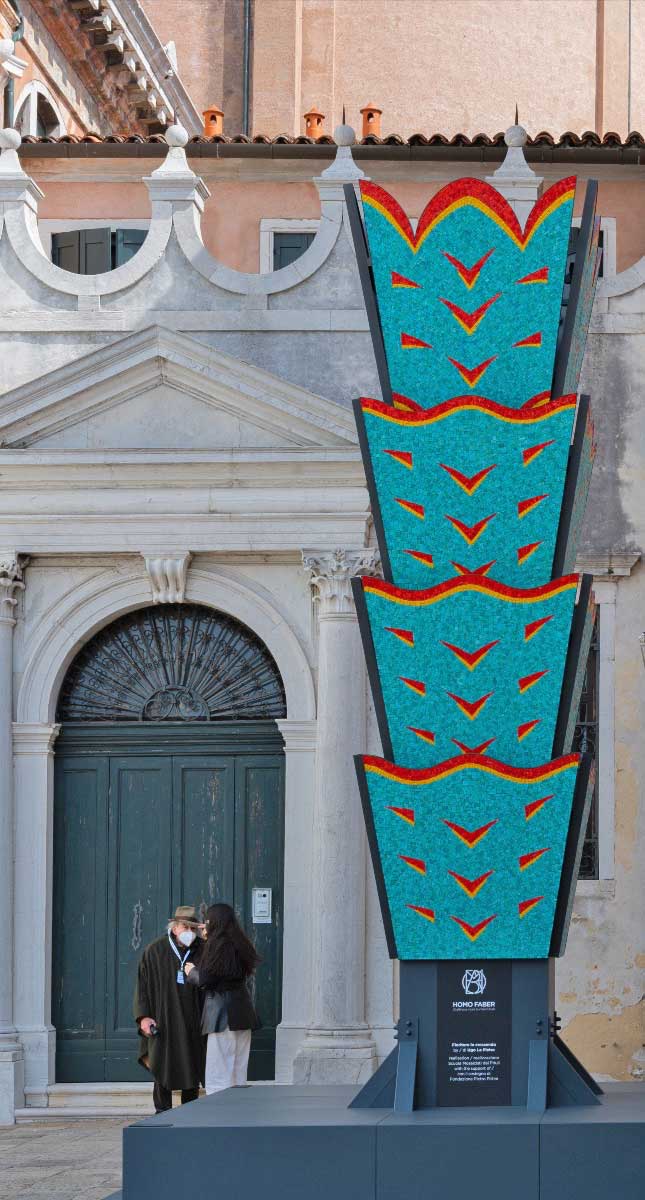 Il premiato designer tedesco invita artigiani e atelier a interpretare il motivo geometrico del sagrato di fronte alla Basilica di San Giorgio utilizzando marmo, mosaico, intarsio di legno, tessuti e altre tecniche. Tra loro Palmalisa Zantedeschi che per questa mostra ha creato il pannello decorativo in marmo “San Giorgio”.