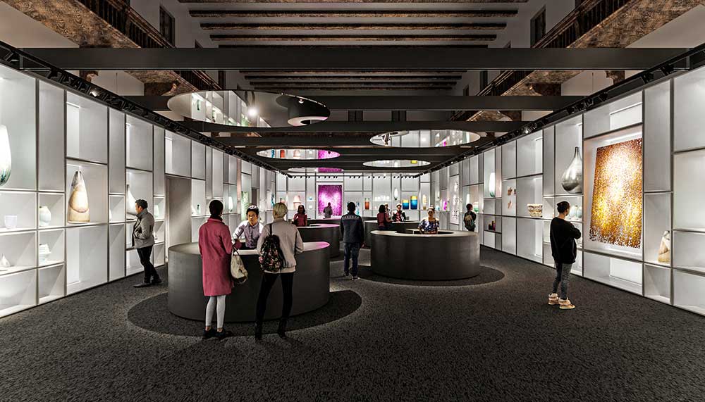 Al centro della stanza, banchi da lavoro di forma circolare sormontati da specchi che permettono al pubblico di ossrvare le performance degli artigiani intenti a praticare il proprio mestiere e a tramandarne le tecniche, le gestualità e il sapere.