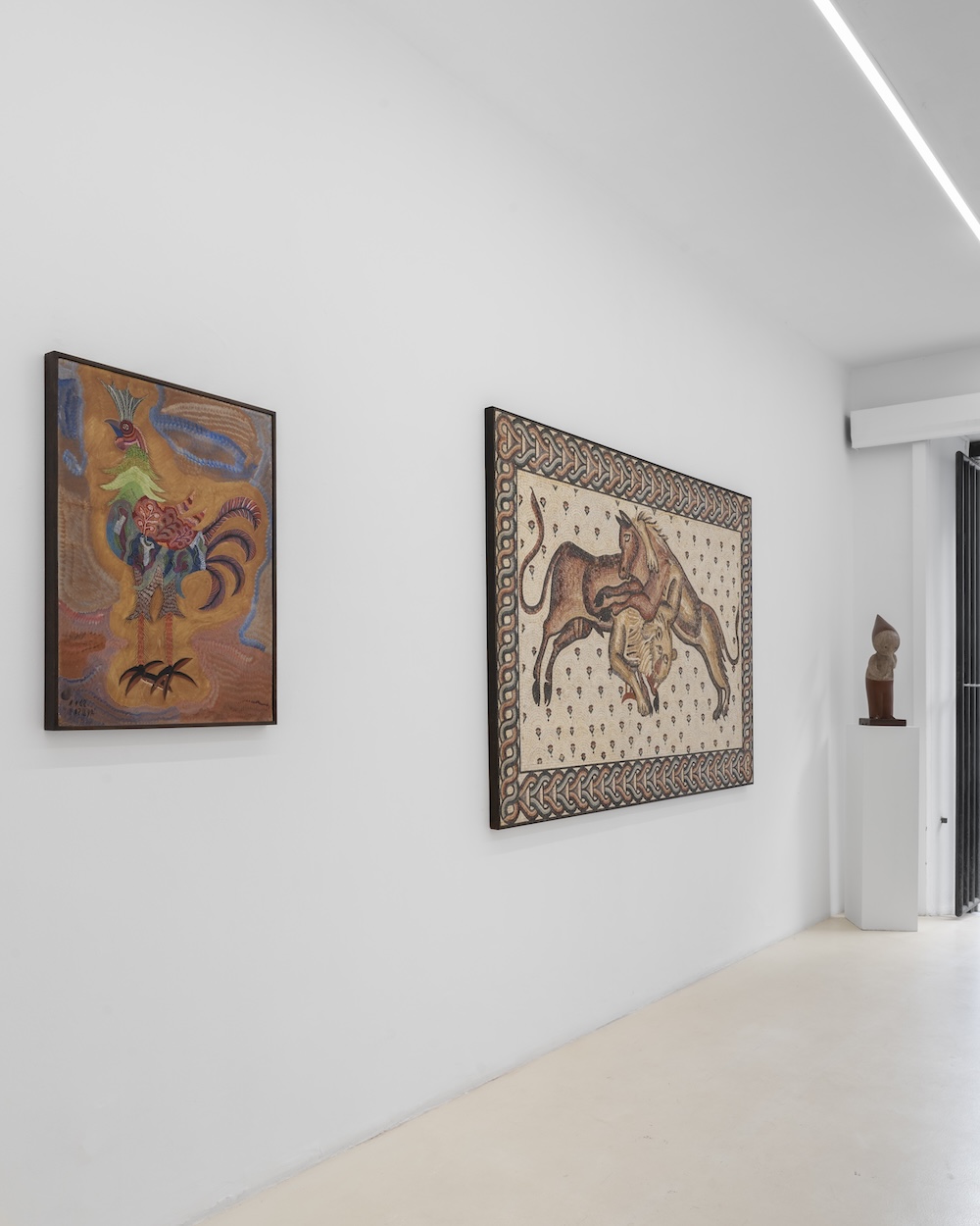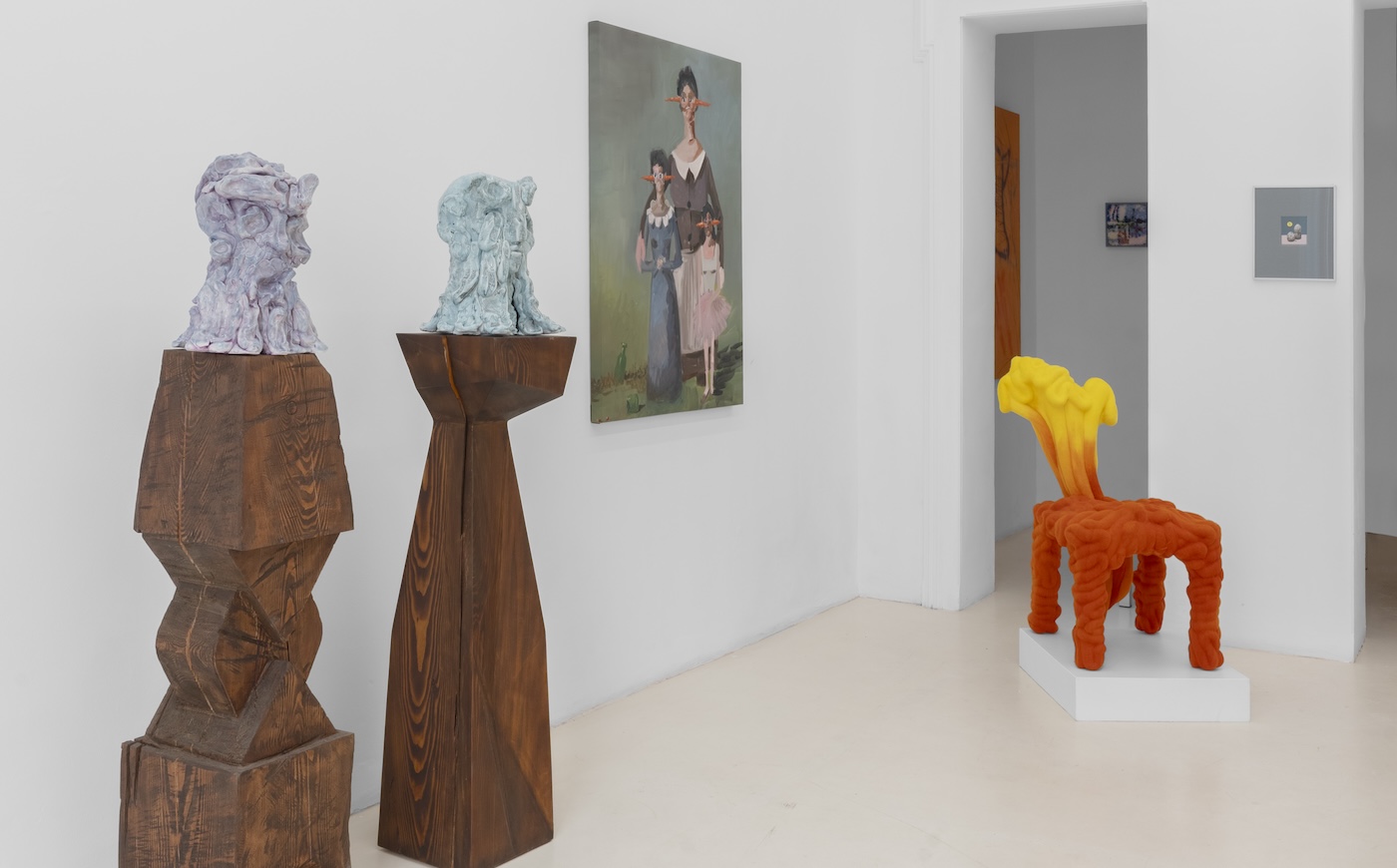 Da sinistra, Chico Da Silva, Untitled, 1968 e Omar Mismar, Fantastical Scene [sic], 2019-2020. In apertura: Fragile Head #6, 2025 e Fragile Head #17, 2025 di Kevin Francis Gray e il dipinto Housekeeper’s Family, 2004 di George Condo.