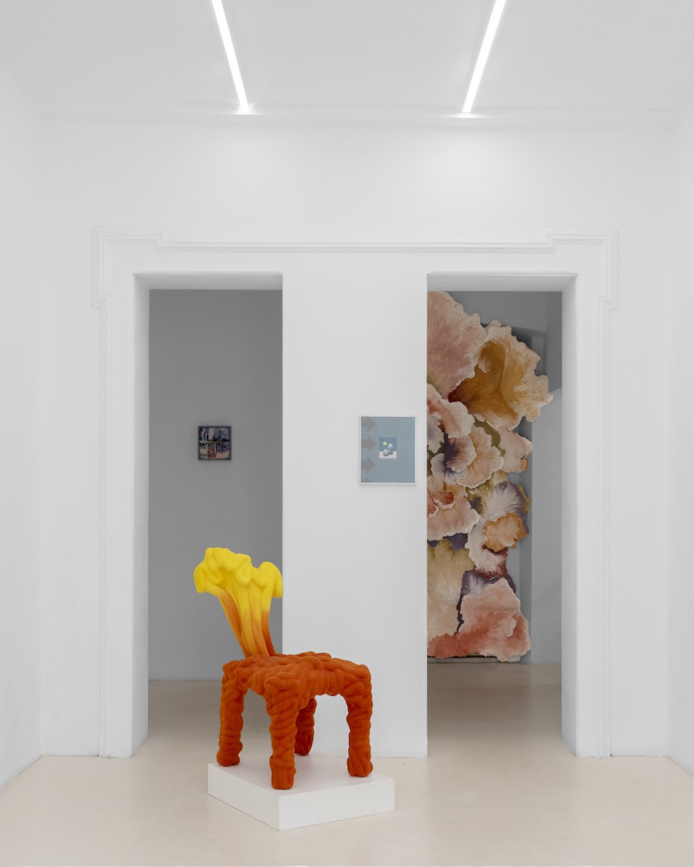 In primo piano, Liam Lee, Chair 15, 2023. A parte, tra le due aperture: Francisca Valador, Yellow circle (homage to Gertrude Abercrombie), 2025.
