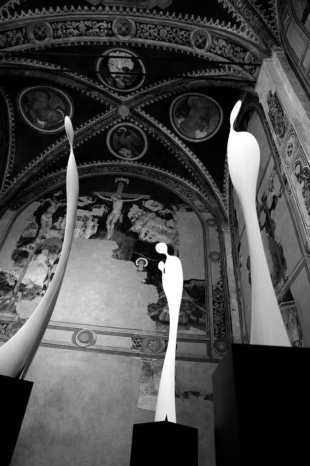 Sculture realizzate in ferro, alte più di due metri e bianche come i sassi del Piave, all’altro capo d’Italia, il luogo dove l’architetto designer e artista vive e lavora,caratterizzate da naturale levità, esposte insieme a bassorilievi creati dall’artista negli ultimi tre anni.