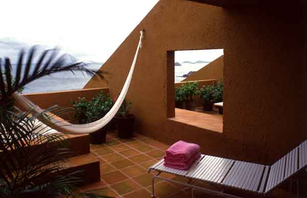 Il risultato é una struttura imponente, che si adagia completamente sul pendio di una piccola baia e che, dall´interno, incornicia la distesa infinitamente blu dell´Oceano Pacifico e del cielo che lo sovrasta. La vista verso l´oceano é resa ancor piú intensa dalla luce, dal vento e dal contrappunto dei colori vivaci – magenta, blu elettrico, rosa – citazioni dall´architettura tradizionale messicana: un caso esemplare di ?regionalismo critico? (termine sempre coniato da Frampton nel lontano 1983 con riferimento, tra gli altri, all´architettura di Legorreta). La struttura, compenetrata e in alcuni punti sospesa sopra il verde lussureggiante di questo punto della costa Ovest del Messico, lungi dal ricordare gli astratti e spesso inabitabili formicai di molte precedenti proto-megastrutture, si distingue per un abile controllo tipologico del rapporto tra spazi privati e spazi comuni. Infiniti corridoi interni, quasi delle rue-interieures e le camere, tutte con vista sull´oceano, che con forma molto allungata si compongono di due spazi fondamentali: un terrazzo esterno, aperto a luce e aria ma completamente privato, e la camera vera e propria, chiusa e a clima controllato, quasi incassata nel pendio ma, grazie al controllo sapiente delle condizioni ambientali, ben illuminata e ventilata.