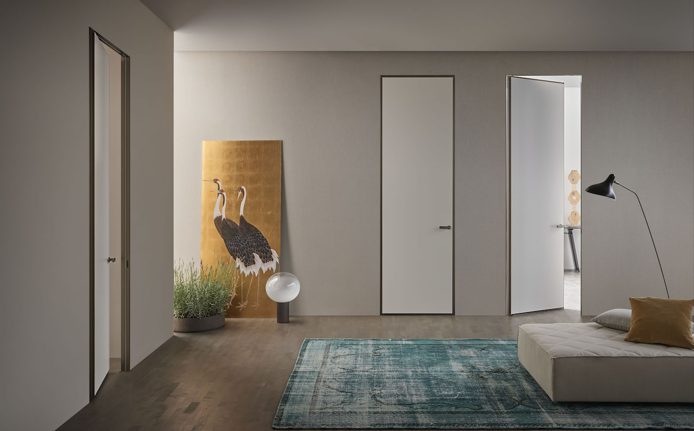 Altaj, concepita per andare oltre il minimalismo della porta a filo muro, sottolinea l’importanza del dettaglio nella progettazione. La porta firmata non scompare nella parete, è anzi evidenziata dal profilo metallico che incornicia l’anta e ne esalta la finitura. L’aspetto decorativo della porta emerge così dalla parete sottolineandone il significato simbolico di attraversamento, di passaggio.