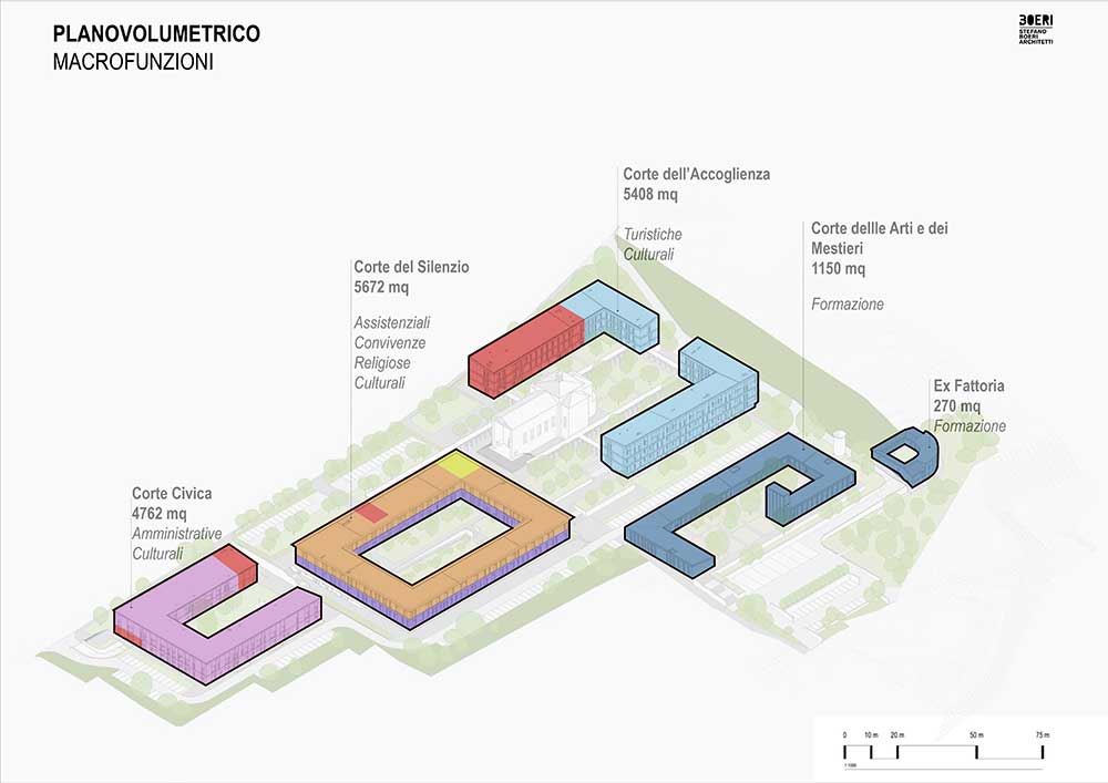 A partire da nord, il planivolumetrico e funzionale prevede la Corte Civica, su due livelli fuori terra dove troveranno posto il municipio, una sala polifunzionale e una biblioteca pubblica; la Corte del Silenzio, su due piani fuori terra, con le residenze dei religiosi, una struttura di accoglienza e assistenziale da destinare a casa di riposo e alcuni ambienti di carattere museale e liturgico; la Corte dell’Accoglienza, dedicata a funzioni di ospitalità per i giovani, con sale ricreative, mensa e sale per la formazione; e la Corte delle Arti e del Mestieri che su un unico livello fuori terra ospiterà prevalentemente laboratori didattici e spazi di trasformazione dei prodotti provenienti dalle filiere locali.