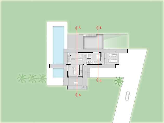 La villa si sviluppa su tre livelli: il piano terra ospita il soggiorno a doppia altezza, la cucina e la zona-pranzo che si prolunga in uno spazio esterno protetto, la camera padronale. Nel vasto ambiente del soggiorno, con vetrate ad angolo senza profili metallici, una scala a sbalzo in acciaio e gradini di legno collega ad un soppalco con camera e zona studio o scende verso il piano interrato che ospita altre due camere e un grande ambiente living affacciato su un patio incassato nel terreno. I prospetti della costruzione sono quasi interamente intonacati in bianco, a sottolineare il legame con il contesto mediterraneo. Le superfici interne sono rivestite in listoni di rovere, mentre la pavimentazione della zona ovest esterna è in gres porcellanato grigio-cemento.