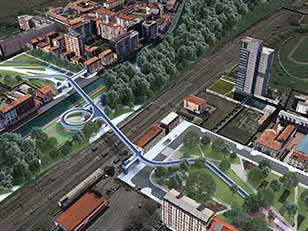 Ai concorrenti veniva chiesto anche di progettare un nuovo hub intermodale nell’area tra le vie Lodovico il Moro e Martinelli e il collegamento ciclopedonale a raso tra quest’ultima e il confine sud della futura area di interscambio, oltre a definire le linee guida per tale area.