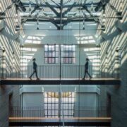 A specchio color oro anche il soffitto interno, un unico foglio metallico senza giunture lungo 22 metri che con i riflessi dell’acqua crea un effetto caleidoscopico per lo spazio interno ricco di luce e con viste panoramiche sulla costa e sulla città.